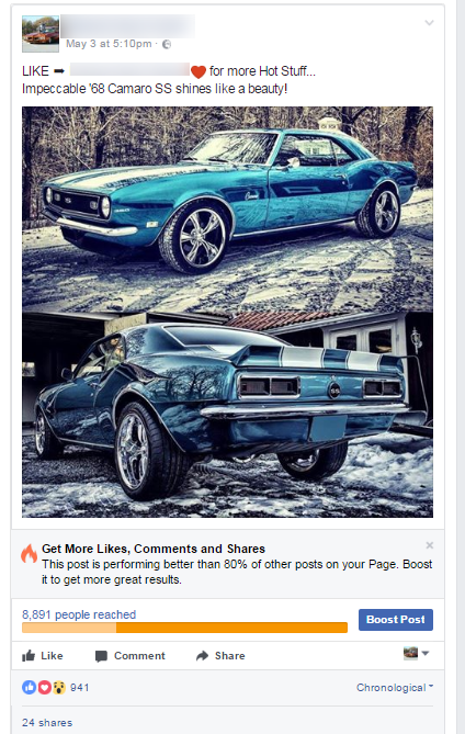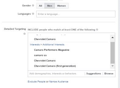 The car on the photo is 68’ Chevrolet Camaro SS, so I choose the following audience, get a huge number of likes and then INVITE the people to LIKE the page. The invites come from the page Itself not my name ?, so I use page & brand credibility. You can get 50-100 Likes for $1 for certain topics, that is $0.01-$0.02 per LIKE. But choose a very small budget, $1-$2 per day for this technique to work.